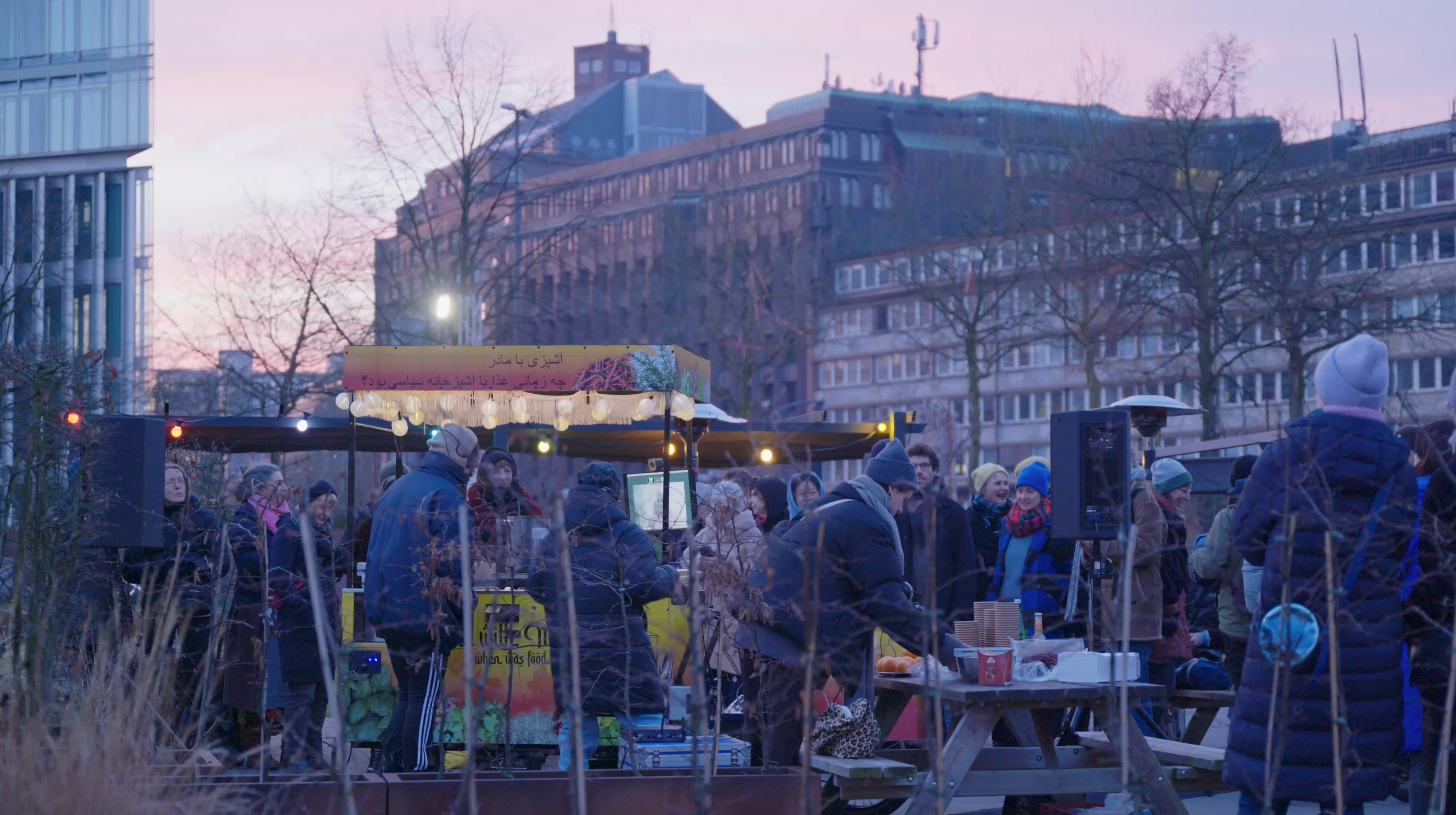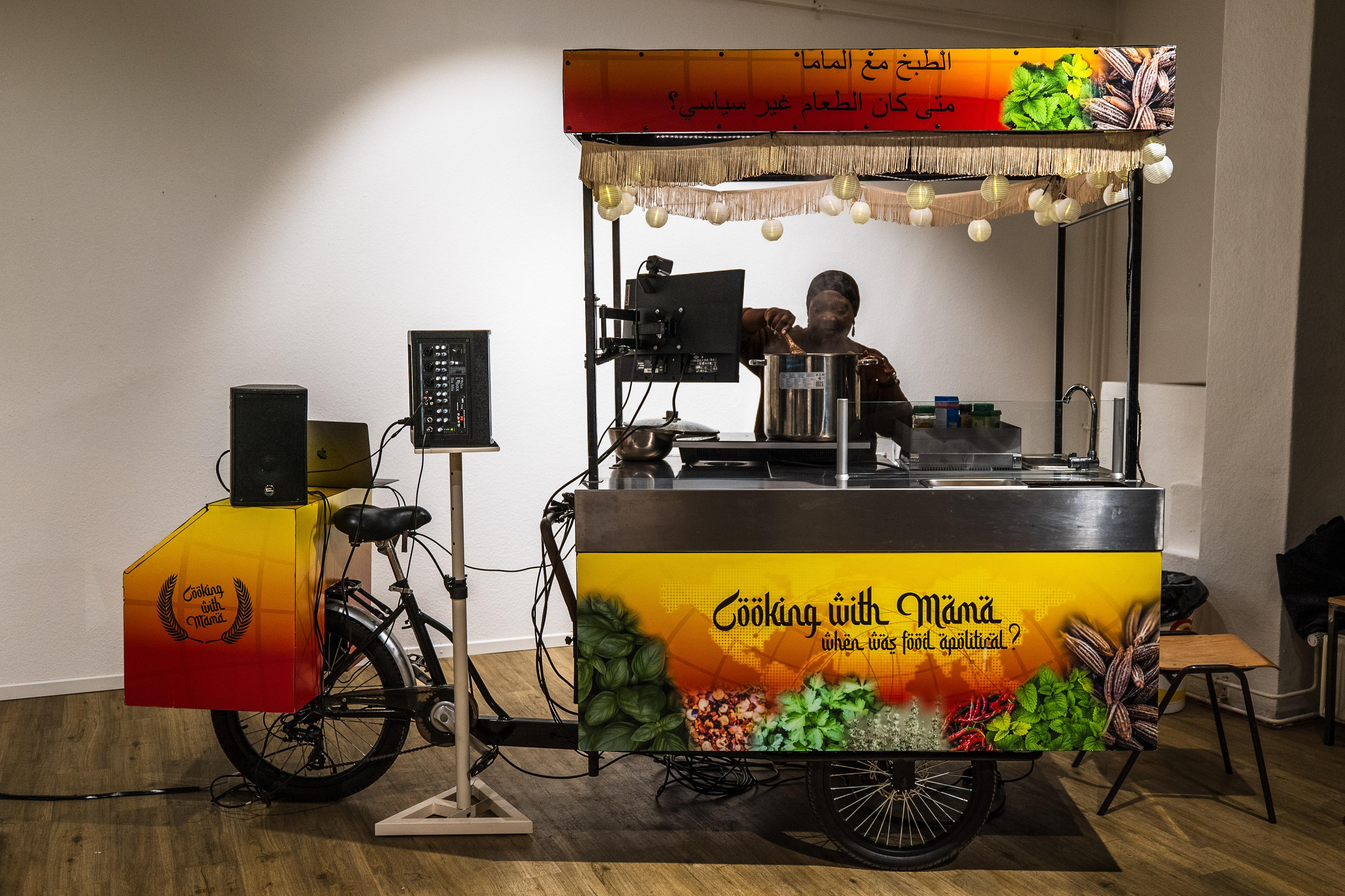 At the centre of Hiwa K’s (*1975, Sulaymaniyah, IQ-KR) artistic work are the everyday practices of encounter, storytelling and political action. His art is explicitly aimed at generating a broad social response and thereby bringing about real change. The performance Cooking with Mama illustrates this approach. The artist invites people with a history of migration to call good friends and relatives and to cook their favourite dishes in front of an audience and then share a meal together. To this end, he has developed a street kitchen bike inspired by food stands in Iraq and Syria.